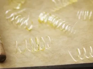 Dip a tablespoon in the caramel and hold the wooden spoon over the pot, letting the caramel slowly catch onto the handles of the wooden spoon. Slowly twirl the wooden spoon so that the caramel wraps around it, spiraling into a coil or “spring”. After about 5 to 8 rotations, set aside the spoon to set for just a minute, then carefully twist and remove the spring and set aside. Repeat this with the remaining sugar (it does take a little practice to develop a rhythm and flow) and don’t worry if a few springs break or aren’t perfect – these can be crushed up and sprinkled onto desserts or ice cream. If the sugar becomes to hard to work with, put it back on low heat and stir just a little to re-melt it.