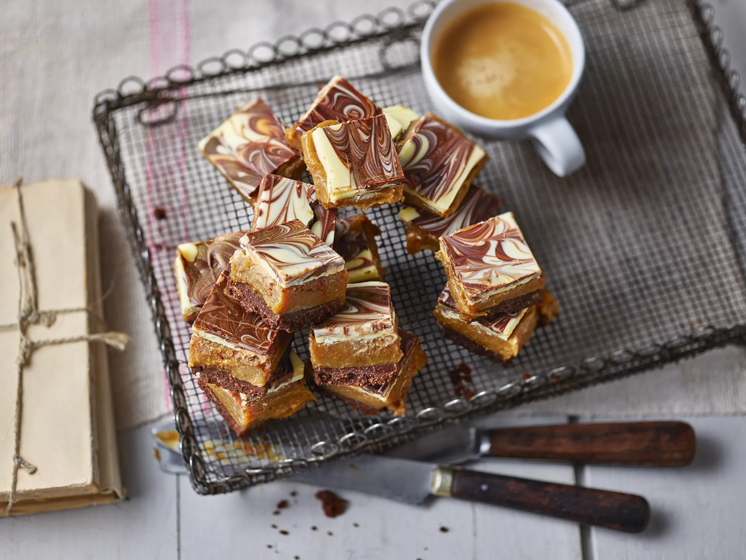 - Melt the chocolate in separate bowls. Pour the white chocolate over the caramel and then add spoonfuls of the melted dark chocolate. Swirl together with a spoon for a marbled effect.
