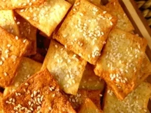 Brush squares lightly with egg wash and prick all over with a fork. Sprinkle with salt and sesame seeds and bake until lightly browned, about 13 minutes.