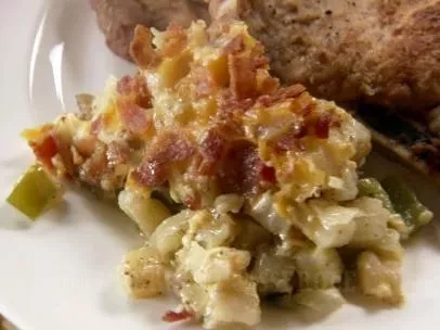 2. Melt the butter in a large skillet and saute the chiles and onions until browned, almost blackened. Add the frozen hash browns, some salt and pepper and toss together. Tip into a buttered baking dish and top with the cheese and bacon. Bake until hot and bubbly, about 30 minutes.