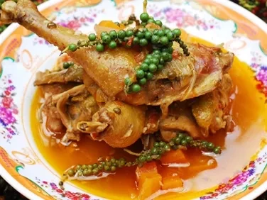 1. Lightly bruise half of the pepper corns in a mortar and pestle. Remove and transfer to a large mixing bowl. Add garlic, 2 teaspoons salt, 1 teaspoon sugar and chicken. Mix and coat the chicken pieces well and marinate covered and refrigerated for 1 hour.