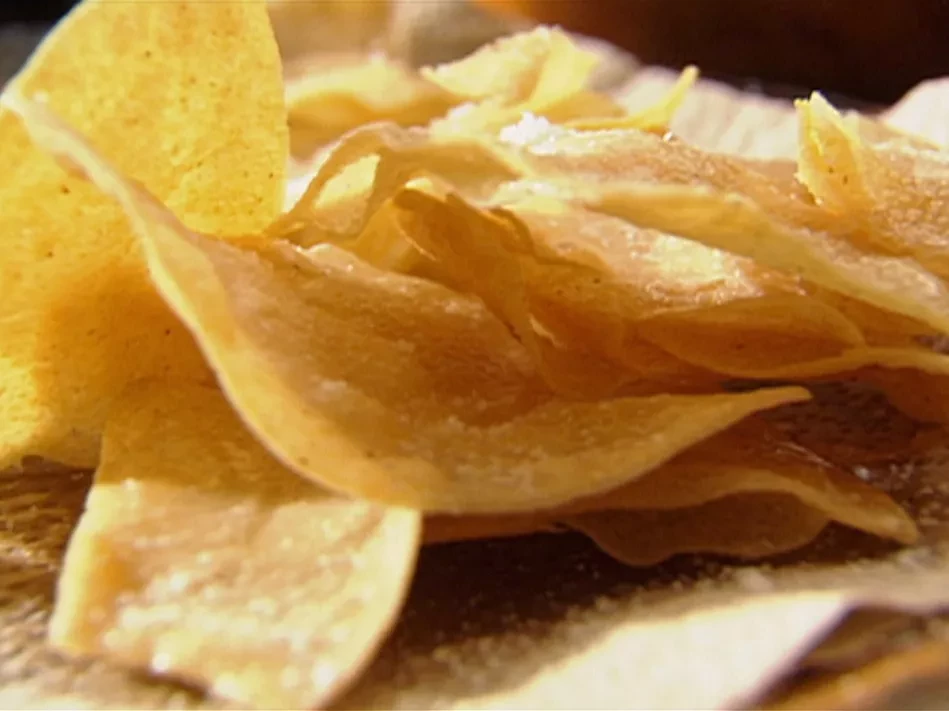 3) To make the chilaquiles: pour about four tablespoons of vegetable oil into a large saute pan over medium heat. When the oil is hot, add the tortillas, working in two or three batches, and cook until lightly browned and nearly crisp. Drain the tortillas on paper towels and discard the remaining oil. Wipe the pan with a paper towel.