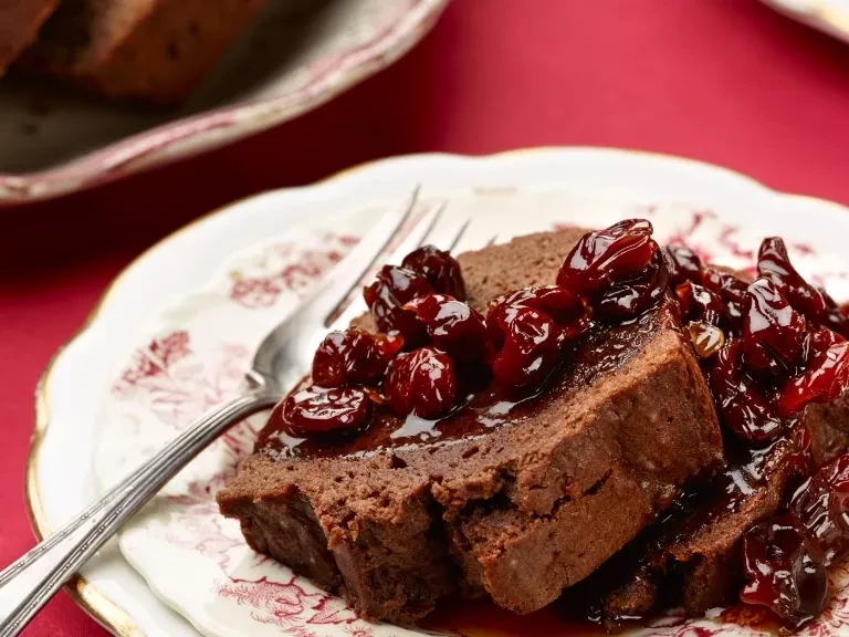 For the cherry sauce: Combine the cherries with 1/3 cup water, confectioners' sugar, rum, vanilla, lemon peel, lemon juice, orange juice and cinnamon stick in a medium saucepan. Simmer until the cherries are tender and the sauce is lightly syrupy (it will thicken further when cooled), 12 to 15 minutes. Remove from the heat, discard the lemon peel and cinnamon stick. Add the butter and stir to combine and melt. Serve with the sliced chocolate Bundt cake.