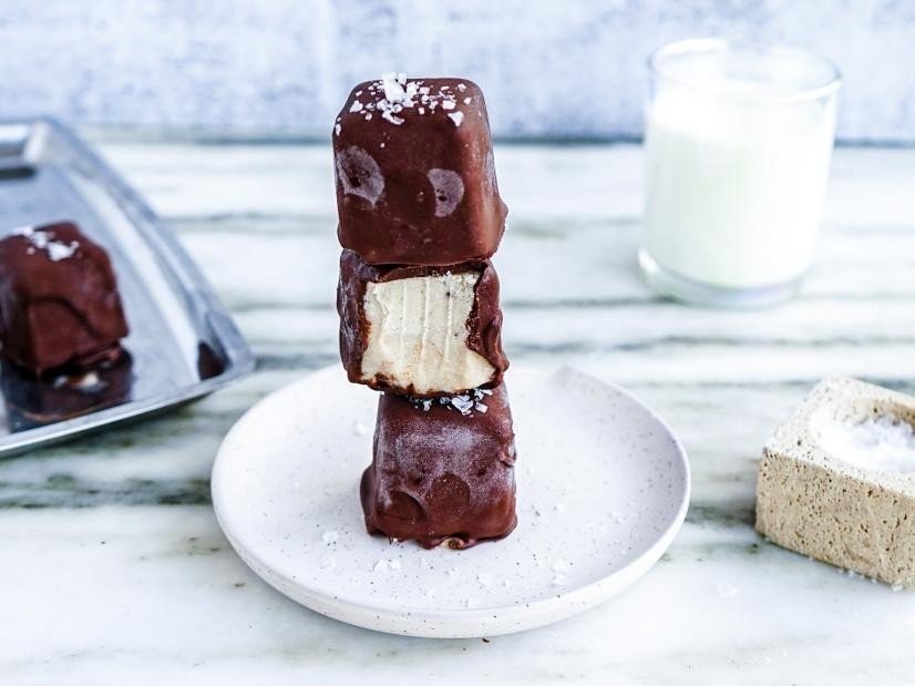 - Remove the ice cube tray from the freezer and pop out 1 frozen nice cream cube at a time. Balance it on a fork or offset spatula and, using a large spoon, coat completely with the chocolate, letting any excess drip off. Place onto the prepared baking sheet to solidify and sprinkle with flaky sea salt. Serve right away or freeze for up to 2 weeks.