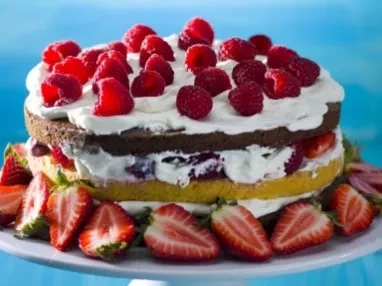 12. To layer the cake start with the chocolate cake with the berries, spread a layer of the cream cheese filling. The second layer should be the plain sponge, add another layer of filling and sprinkle the remaining berries. On the top put the chocolate cake and cover the entire cake with the remaining cream cheese. Garnish with strawberries and raspberries.