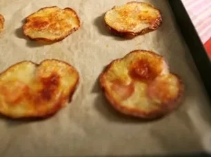 Cover cheese with remaining potato slices. Place a sheet of parchment paper over “wraps” and place a second baking tray on top.