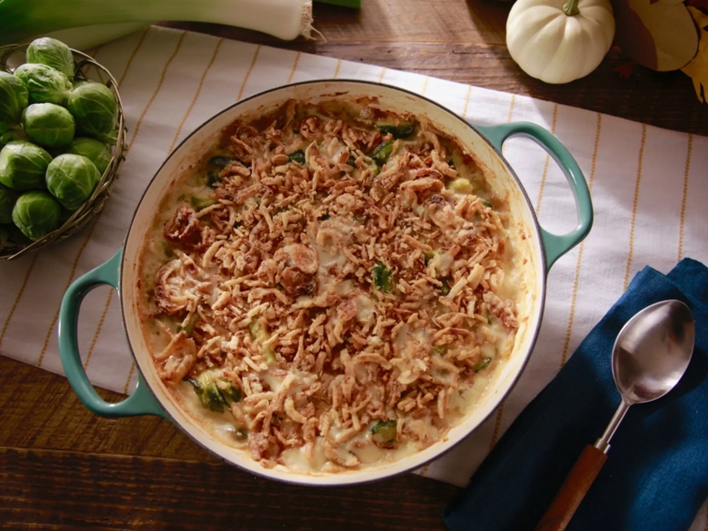 - For the vegetables: In the same skillet used to cook the bacon, heat the butter and oil over medium-high heat. Add the onions and season with 1/2 teaspoon salt and 1/4 teaspoon pepper. Cook, stirring occasionally until light golden, about 5 minutes. Add the mushrooms, 1/4 teaspoon salt and 1/4 teaspoon pepper. Cook until softened, about 8 minutes. Add the Brussels sprouts and the remaining 1/4 teaspoon salt and 1/4 teaspoon pepper. Cook for 5 minutes.