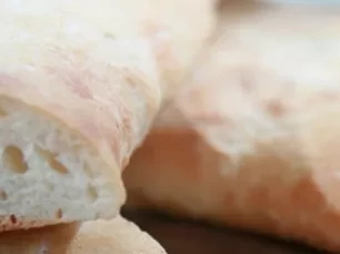 Turn dough out onto a lightly floured work surface and roll up into a cylinder (like you would for a loaf or bread), but then stretch and pull the flexible dough into a rectangle about 20 inches by 8 inches. Cut dough in half (so that each piece is about 10-x-4-inches) and place each on 2 parchment-lined baking trays sprinkled with cornmeal. Cover loaves gently with a slightly damp tea towel and let rise another 90 minutes.