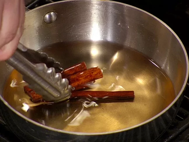 1) Add the water and cinnamon to a saucepan and bring to the boil. Simmer for 10 mins, and then strain out the cinnamon sticks.