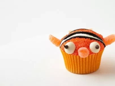 Attach the eyes, mouth, fins and tails by pressing gently into the frosting. Carefully sprinkle with orange nonpareils, leaving the 2 white stripes between the licorice pieces free of orange. Repeat steps for all cupcakes.