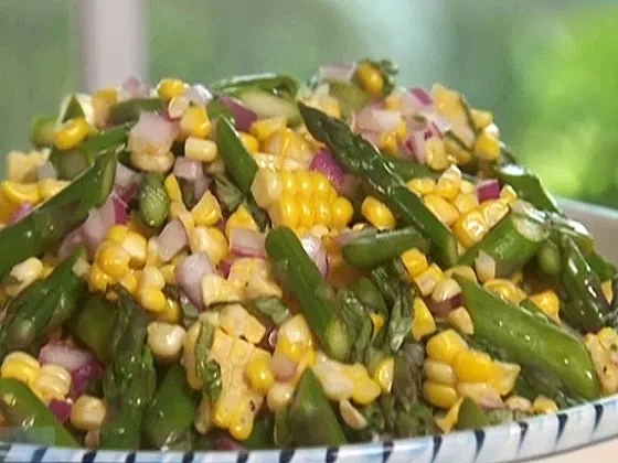 4) In another medium size bowl, mix together the sugar, vinegar, salt and pepper. Drizzle over corn and asparagus.