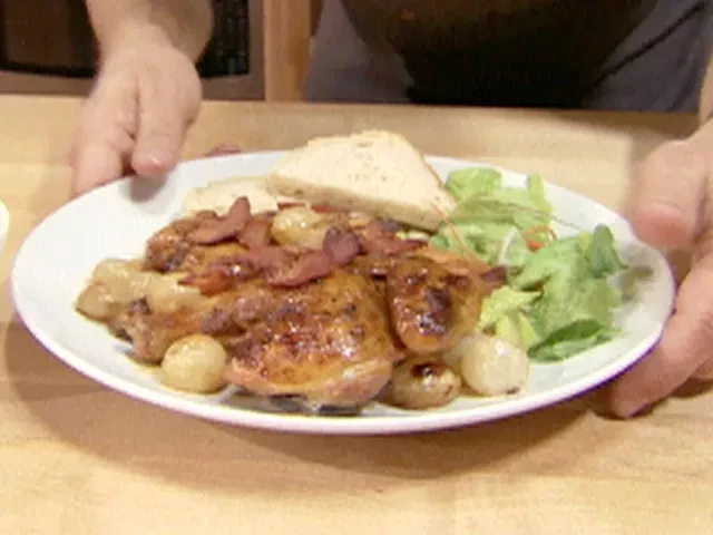 Cornish game hen with bacon and onions