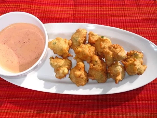 Vegetarian fritters make for a delicious starter - especially with creamy pepper dip.