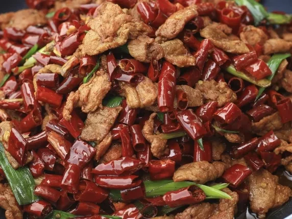 7. On a separate hob heat ½ tablespoon vegetable oil in a wok at high heat. Add the ginger, garlic and chilli, then turn the heat down to medium heat and stir-fry for 1 minute. Immediately add the sauce mixture and bring to a vigorous boil. Once the sauce starts to boil, add the crispy meat into the wok and give it two or three tosses before serving. Garnish with coriander to serve.