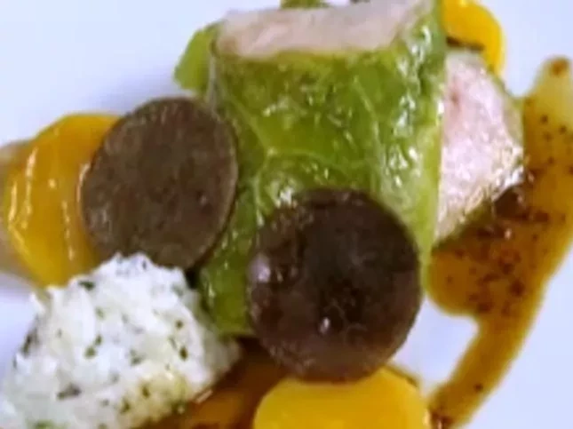 1) Remove the top cylinder portion of the butternut squash and peel with a vegetable peeler. Discard or use the bulb portion for something else. Using a mandoline, finely slice round crisps from the peeled cylinder and hold in ice water for 30 minutes to chill.
