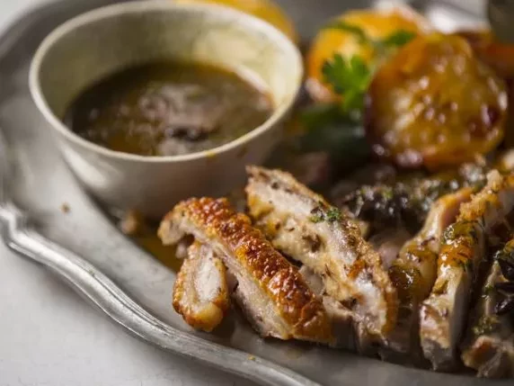 For plating: Carve the pork into thin slices. Lay on a platter. Spoon over the sauce. Serve with salty caramelised apples, steamed green beans and roasted new potatoes.