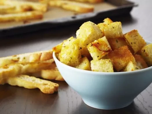 For the crostini, cut thin slices of the bread, about ¼ -inch thick. Arrange them, flat side down, on the baking tray. Brush the slices lightly with olive oil and sprinkle with salt. Place the tray in the oven and bake for 10 to 15 minutes until golden brown.