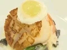 5) Put four dollops of the cold cauliflower puree in the centre of a plate. Top with the vegetables, a medallion of lobster, and a scallop. Place a sea urchin tongue on top of each scallop and top with the fried quails egg.
