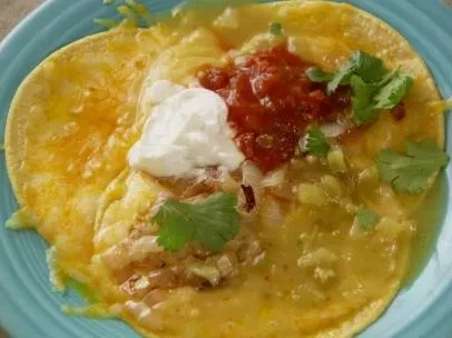 4. To serve, stack three cheesy tortillas on top of one another. Spoon green sauce over the top and add store-bought salsa, sour cream and cilantro as needed. Delish and so, so easy!