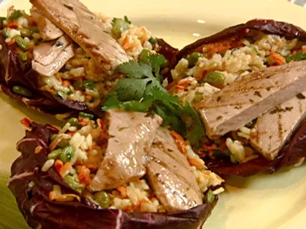 4) Arrange red lettuce or radicchio leaves on individual plates. Spoon edamame-rice salad over top or inside radicchio leaf. Top each with tuna fillets and serve.