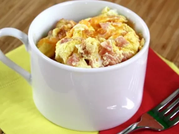 Toast bread and cut into cubes. Set aside. Spray a large microwave-safe mug lightly with nonstick spray. Add bread cubes, egg substitute, cheese wedge pieces, and ham, and stir. Microwave for about a minute. Stir gently, and then top with shredded cheese. Microwave for another 30 to 45 seconds, until scramble is just set. Stir and enjoy!