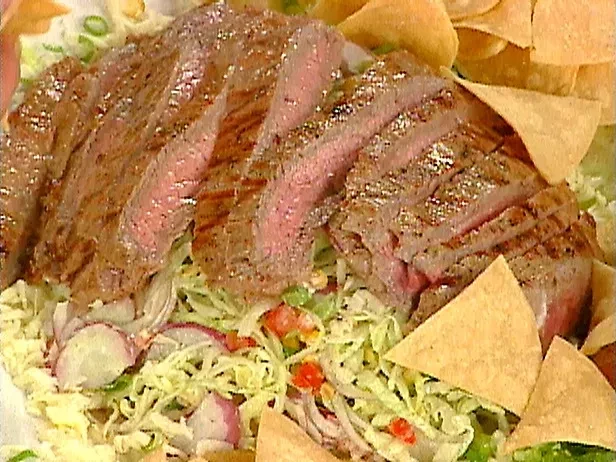 6) Slice the steak, against the grain, into very thin slices. Arrange on a platter with the peppers and onions. Serve with the slaw.