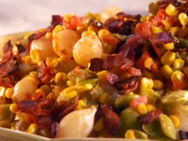 In a large skillet fry bacon until crispy and remove to a paper towel-lined plate, reserving fat in pan. To the skillet add the bell pepper and garlic and cook until softened slightly, about 5 minutes. Add corn, lima beans, pearl onions, hot sauce and cream. Bring to a simmer and cook until vegetables are thawed and tender. Stir in reserved bacon and season with salt and pepper.