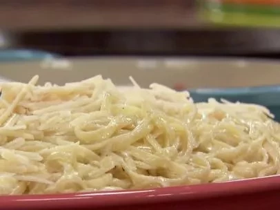 Place half of the Parmesan into a large serving bowl. Pour the warm butter/cream mixture over the top.
