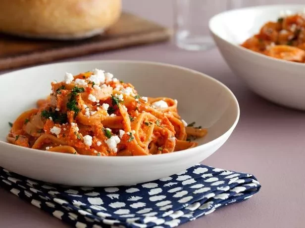 Healthy Fettuccine with Creamy Red Pepper-Feta Sauce