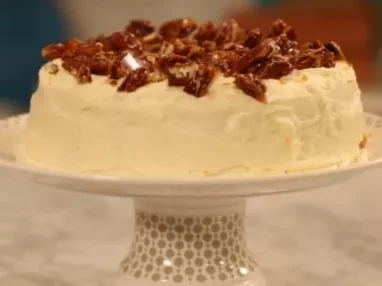 5. Decorate the top and sides of the cake with the mix. For the pecan brittle, heat the sugar in a frying pan until it reaches a medium amber stage. Remove it from the heat and add the pecans and five spice, stir carefully and tip it out onto baking parchment.