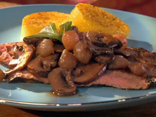 Flank Steak with Merlot Mushrooms and Pearl Onions over Toasted Polenta