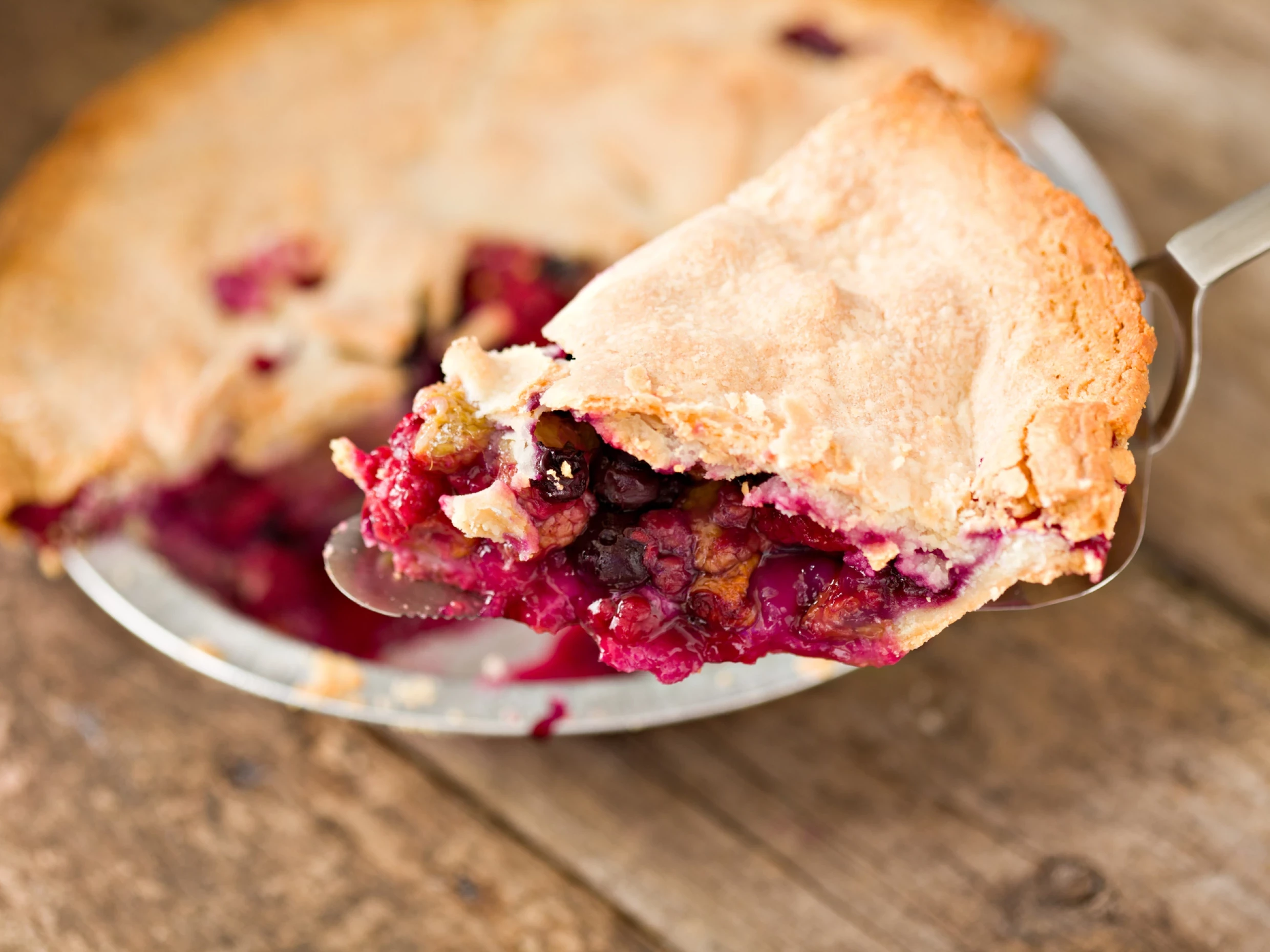 Roll the second disc of dough in the same manner and place it on top of the fruit filling. Trim and pinch the edges of the dough and use scissors or a paring knife the cut holes in the top to allow steam to escape. Brush the top of the pie with the egg wash and place the pie on a parchment or foil-lined baking tray. Bake the pie for about 50 minutes, until the crust is a rich brown and the filling is bubbling. Cool the pie completely to room temperature before slicing, or chill and serve cold.