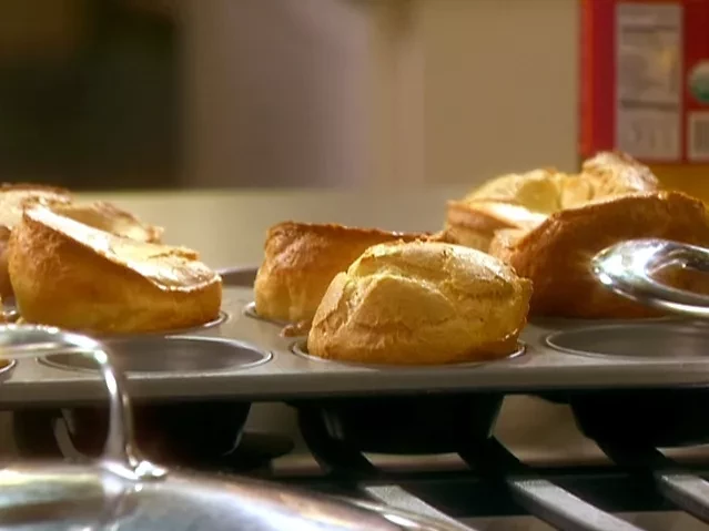 Using a pastry brush, coat 8 muffin cups with 1 tablespoon of the melted butter and put the tin in the oven for 5 minutes. Meanwhile, mix the eggs in a blender until light yellow. Add the warmed milk and blend. Add the flour, salt and remaining melted butter, and blend until smooth. Pour the batter into the warmed muffin tin and return it to the oven to bake until golden, about 35 minutes. Remove from the oven and serve warm.