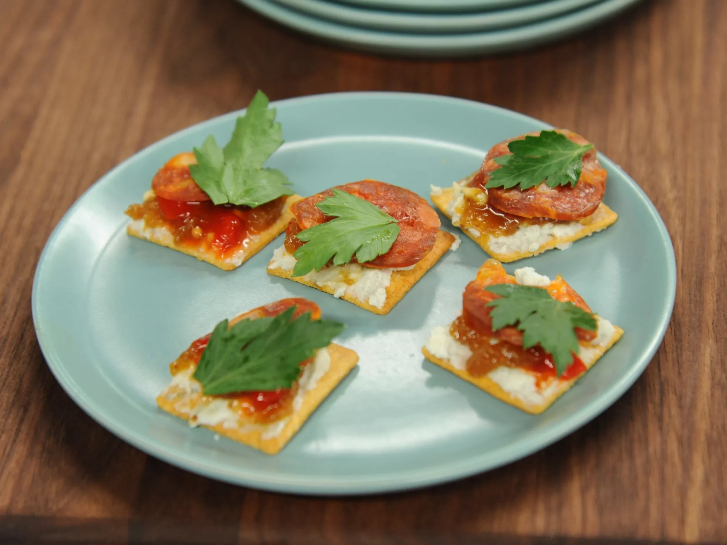 Mix together the blue cheese and ricotta in a small bowl until smooth. Using a butter knife or spoon, apply the cheese mixture to the crackers. Top with the fig spread, about 1 teaspoon of spread per cracker. Place a coin of chorizo on each cracker. Top with a dollop of cherry pepper relish, about 1/2 teaspoon per cracker, and serve.