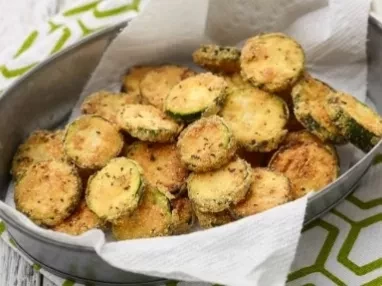 4) Working in small batches, toss the courgettes coins in the eggs, then coat in the cornmeal mixture to cover completely. Carefully drop the courgettes into the oil, and fry until golden brown, about 2 minutes on each side or until crisp. Remove from the oil with a slotted spoon and place on the prepared plate. Season with salt, cool slightly and serve.