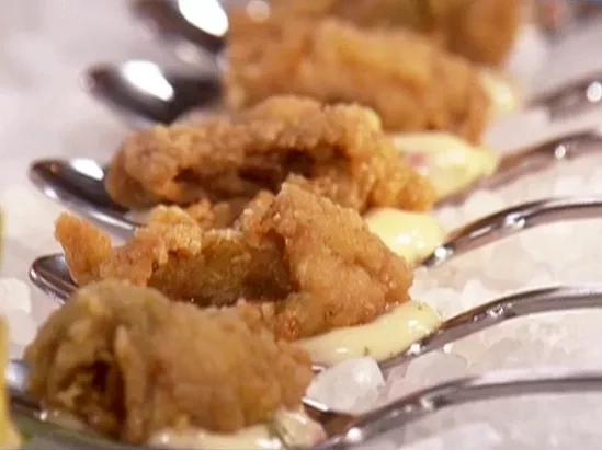 4) On each spoon, place a dollop of tartar sauce and top with an oyster. Serve.