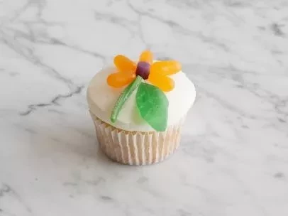 If necessary, snip the green jelly candy into a piece about 2 inches long. Put it on the cupcake next to the candy drop and between 2 petals-it should hang over the cupcake slightly.