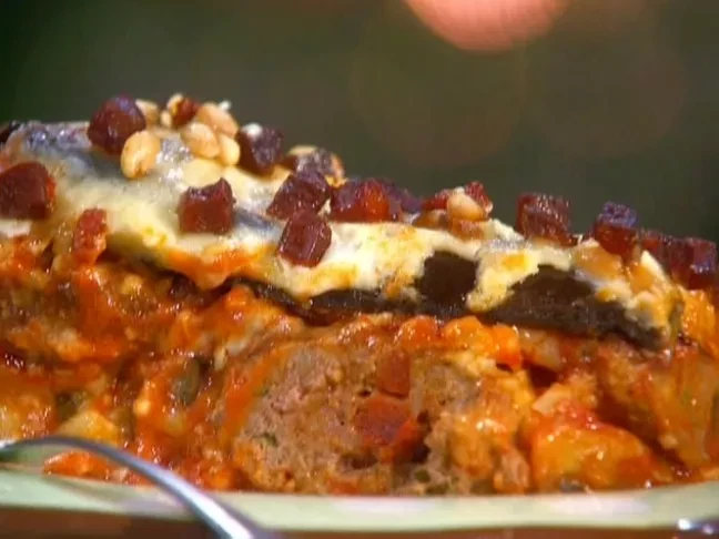 5) Cover bottom of baking dish with about 335ml of Bechamel sauce. Add 1 layer of eggplant then top with beef patties and sauce. Sprinkle with grated Manchego cheese and toasted pine nuts. Repeat steps and finish with a layer of eggplant. Pour remaining Bechamel sauce on top and sprinkle with fried chorizo, remaining pine nuts and rest of Manchego cheese. Broil in middle of the oven for about 15 to 20 minutes or until golden brown.
