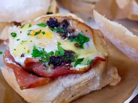 3. To assemble, preheat the oven to 180°C/350°F/4 gas. Cut off the top 1/4 of the bread rolls and set aside. Using a small serrated knife, cut out a large cavity in the bread rolls, making sure you don’t cut through. Line the sides with the bacon then layer the mushrooms, sausage and some of the crumbled black pudding on the base. Crack an egg into each hole then sprinkle with cheese, the remaining black pudding, parsley and a little black pepper.