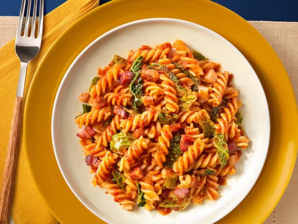 8. Drain the pasta al dente, toss in the pan with the tomato sauce. Drizzle with olive oil, add a pinch of freshly ground pepper and serve with the cabbage sprinkled on top.