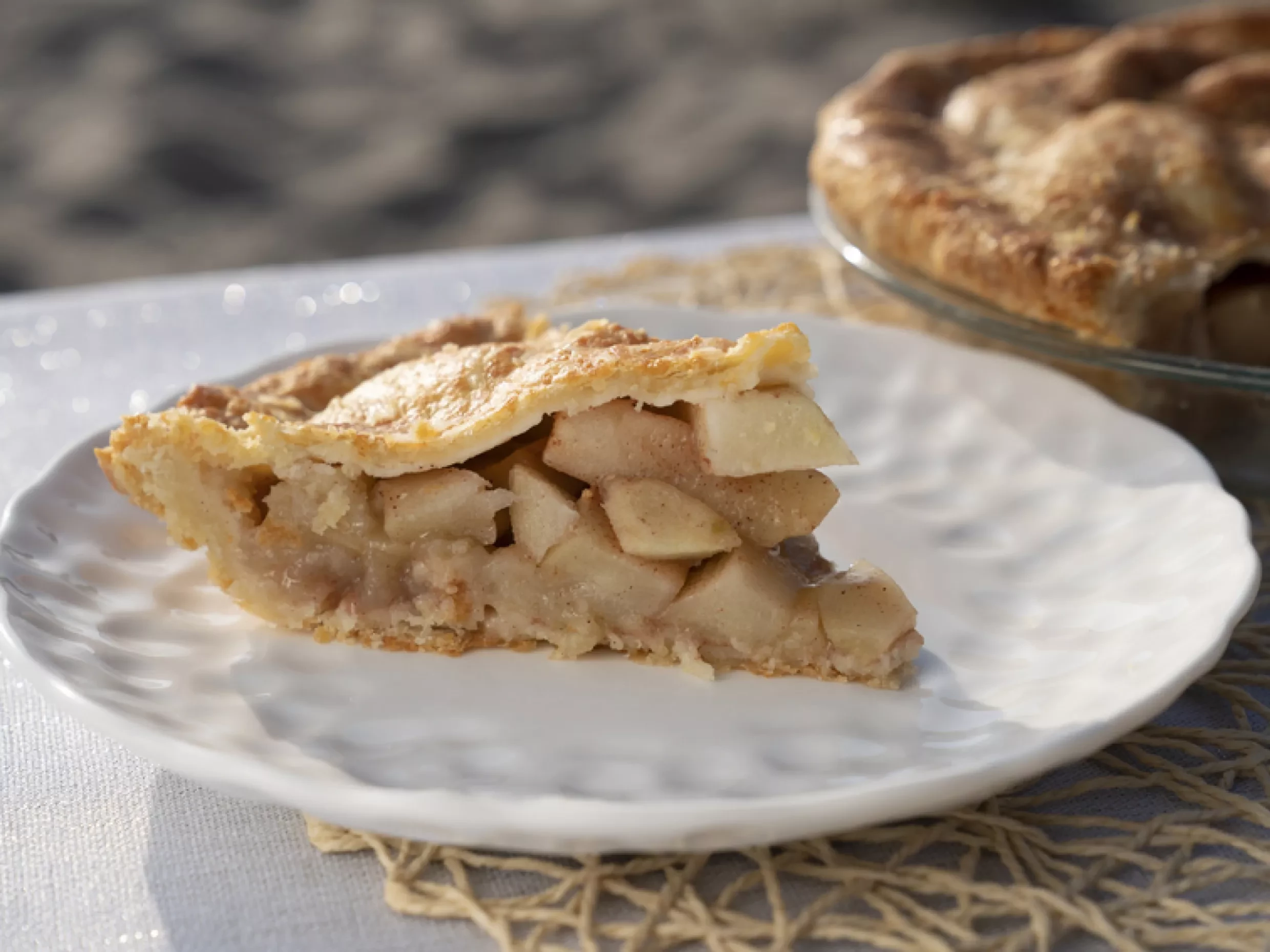 - Divide the dough in half. Roll out one of the dough pieces to an approximately 11-inch round and line the bottom of a 9-inch pie plate. Fill the pie crust with the apple mixture. Roll out the remaining dough into another 11-inch round and place on top. Trim the edges so there is a 1/2-inch overhang around the plate. Tuck the overhang under itself and press down to seal the edge. Using 2 knuckles and the tip of your finger, crimp the edges to make a decorative edge. Cut an X in the center of the top pie crust and open the corners to make a small hole in the center of the pie. Brush the pie evenly with the egg and sprinkle with the Parmesan cheese.