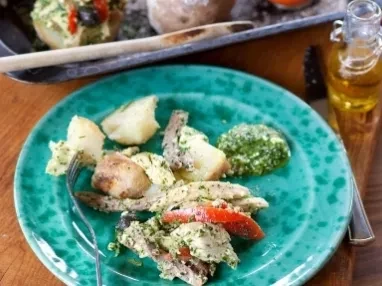 To serve, remove the salt crust from the potatoes then split them open and pile in the golden turkey filling and serve with the extra pesto.
