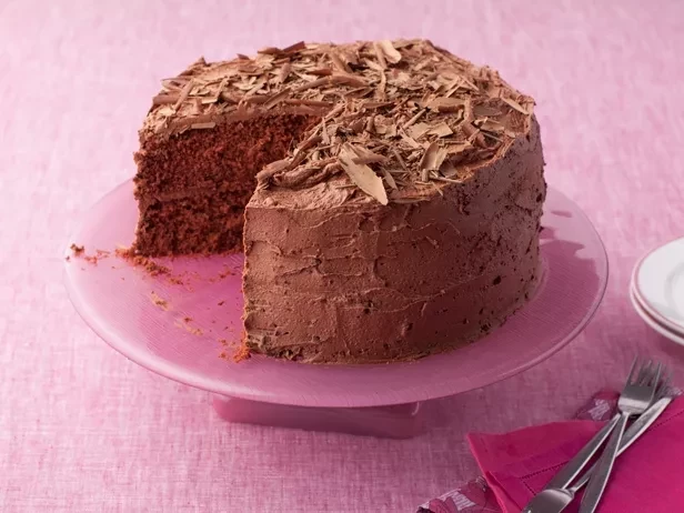With a large knife, scrape some shavings from a block of dark chocolate. Scatter the shavings over the cake.