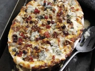 Layer the potatoes, celeriac, onion, garlic, walnuts, pancetta and 150g Gorgonzola in a large heavyweight baking dish.
