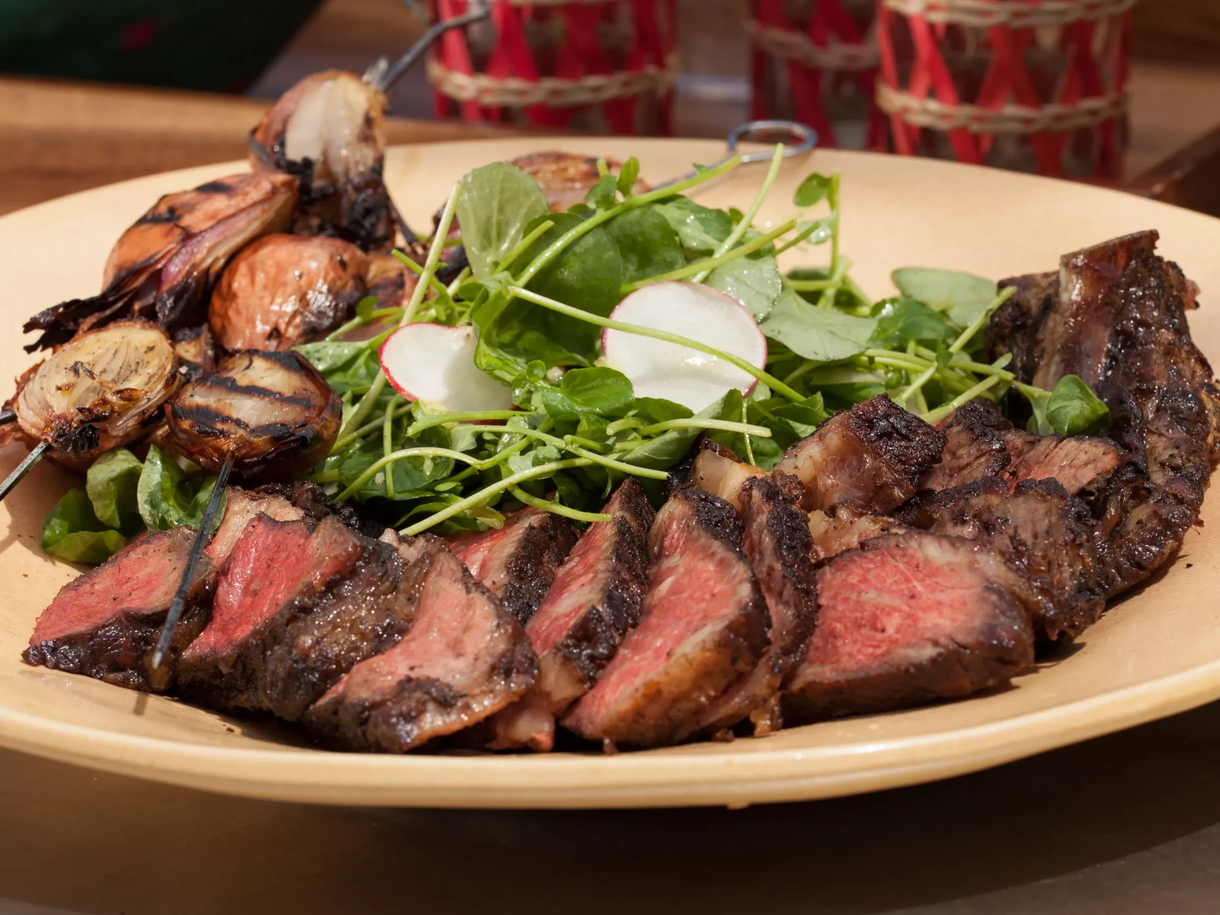 5. Measure out 1 tablespoon of the steak juices that have settled onto the plate and put in a medium mixing bowl. Whisk in the mustard, shallots and vinegar. Toss the watercress in the dressing, along with the tarragon leaves and radish slices.