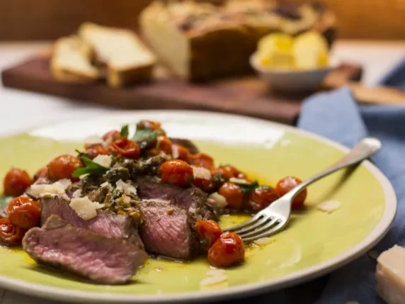 Place the steaks onto warmed plates, top with tomatoes and a dusting of freshly grated or shaved Parmesan, and serve with a red onion and rocket salad toss in a light lemon vinaigrette.