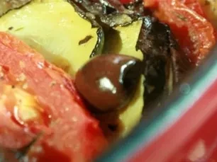 Brush an 8 or 9-inch cast iron skillet with olive oil and arrange eggplant, zucchini and tomato slices in a circular fashion, overlapping each other closely, inserting basil leaves and olives occasionally between the slices. Season lightly and place a circle of parchment paper directly over the tian.