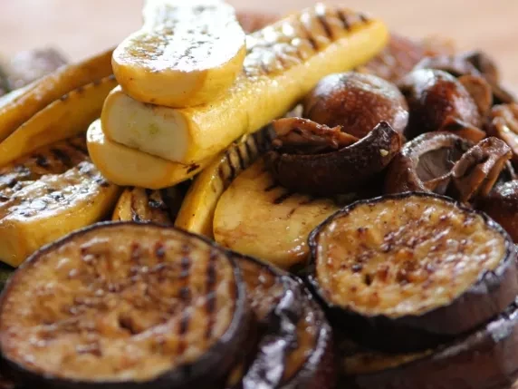 2. Brush the sliced courgette, yellow squash, aubergine, onions and mushrooms with olive oil and sprinkle with salt and pepper. Grill in batches until soft and tender, about 4 minutes per side.