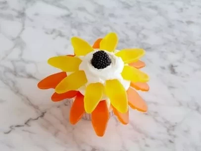 Put the raspberry candy in the center of the cupcake. Put 8 fish, heads up, in a petal pattern around the raspberry. Put the remaining 13 fish in a petal pattern around the first set.