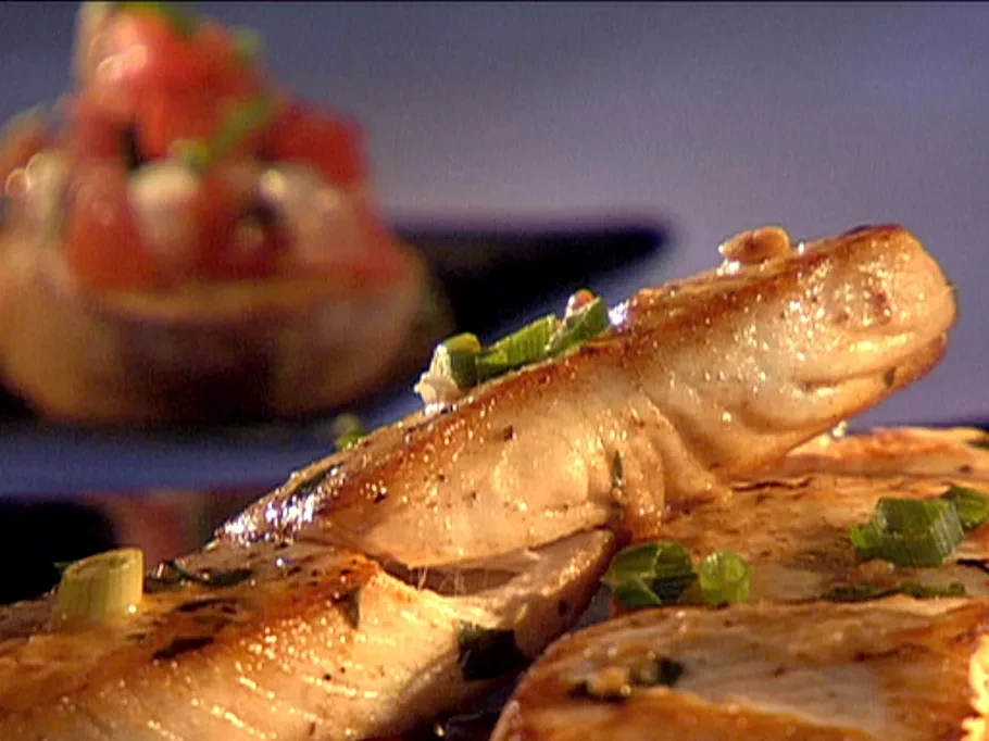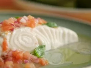 4) While the cioppino is cooking, prepare the halibut. Season the fillets with salt and pepper and fresh thyme. Heat a large nonstick saute pan and add a 2-count of olive oil. Cook fillets 4 minutes on 1 side then turn once briefly before setting on paper towels to drain.